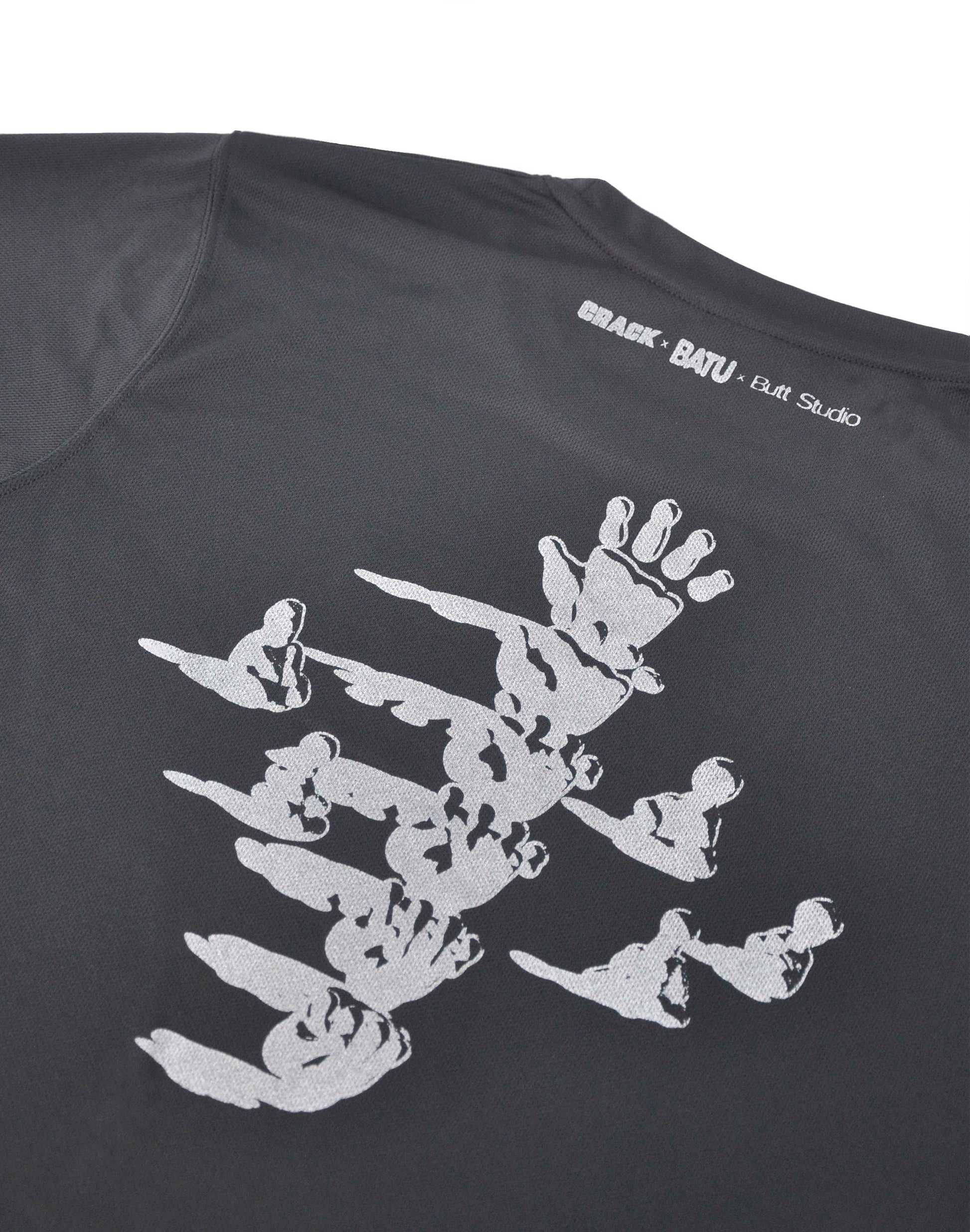 Performance ready, this limited edition tee is designed using a 4 location print in silver metallic ink. Features Crack x Batu x Butt Studio logos on the back and 'Still Independent' on the sleeve.