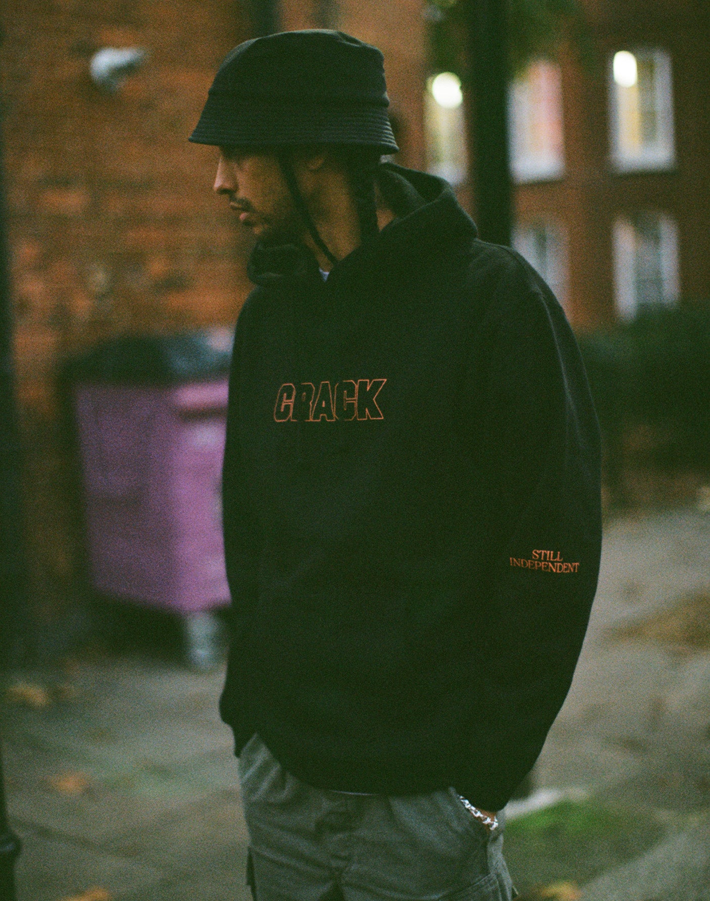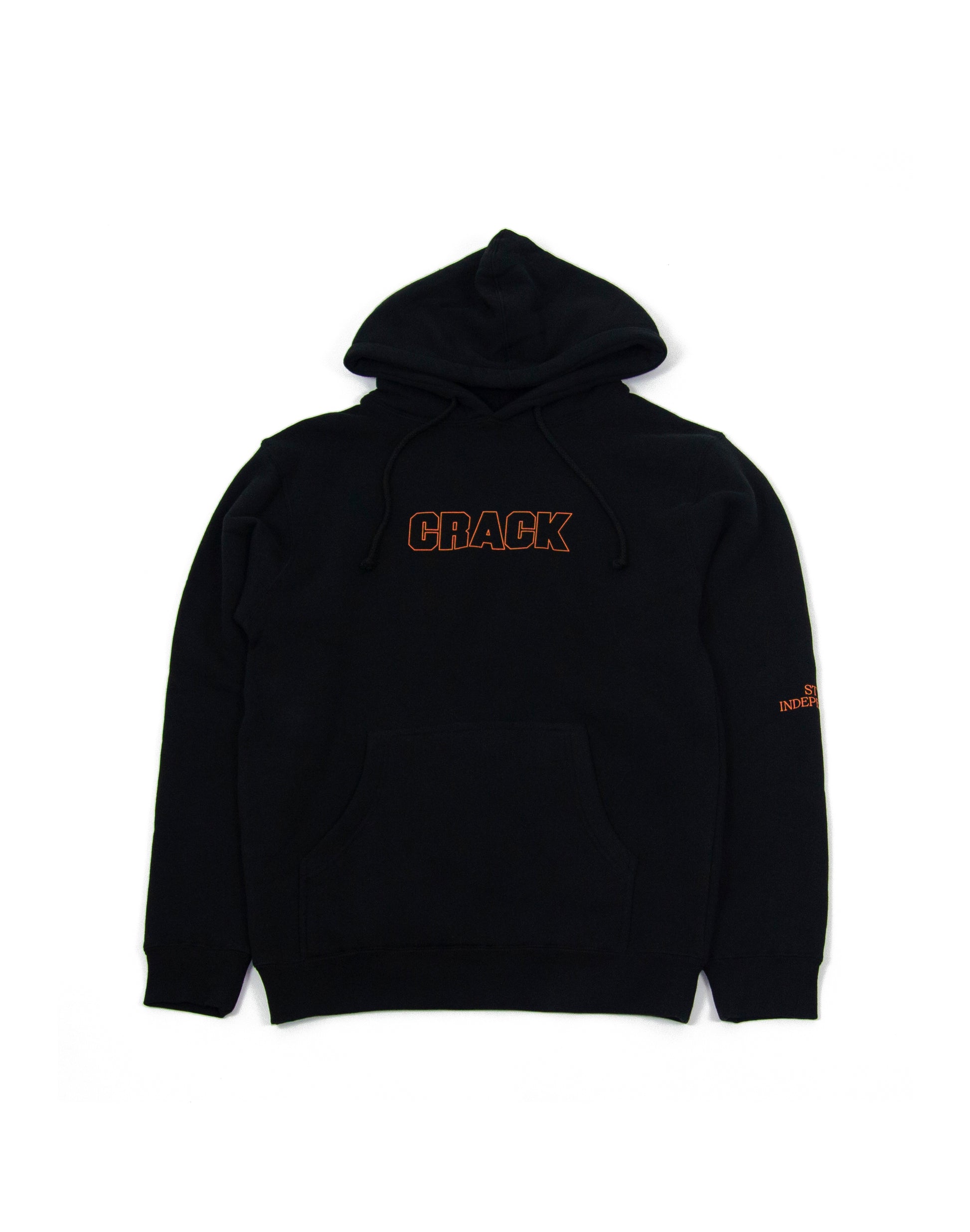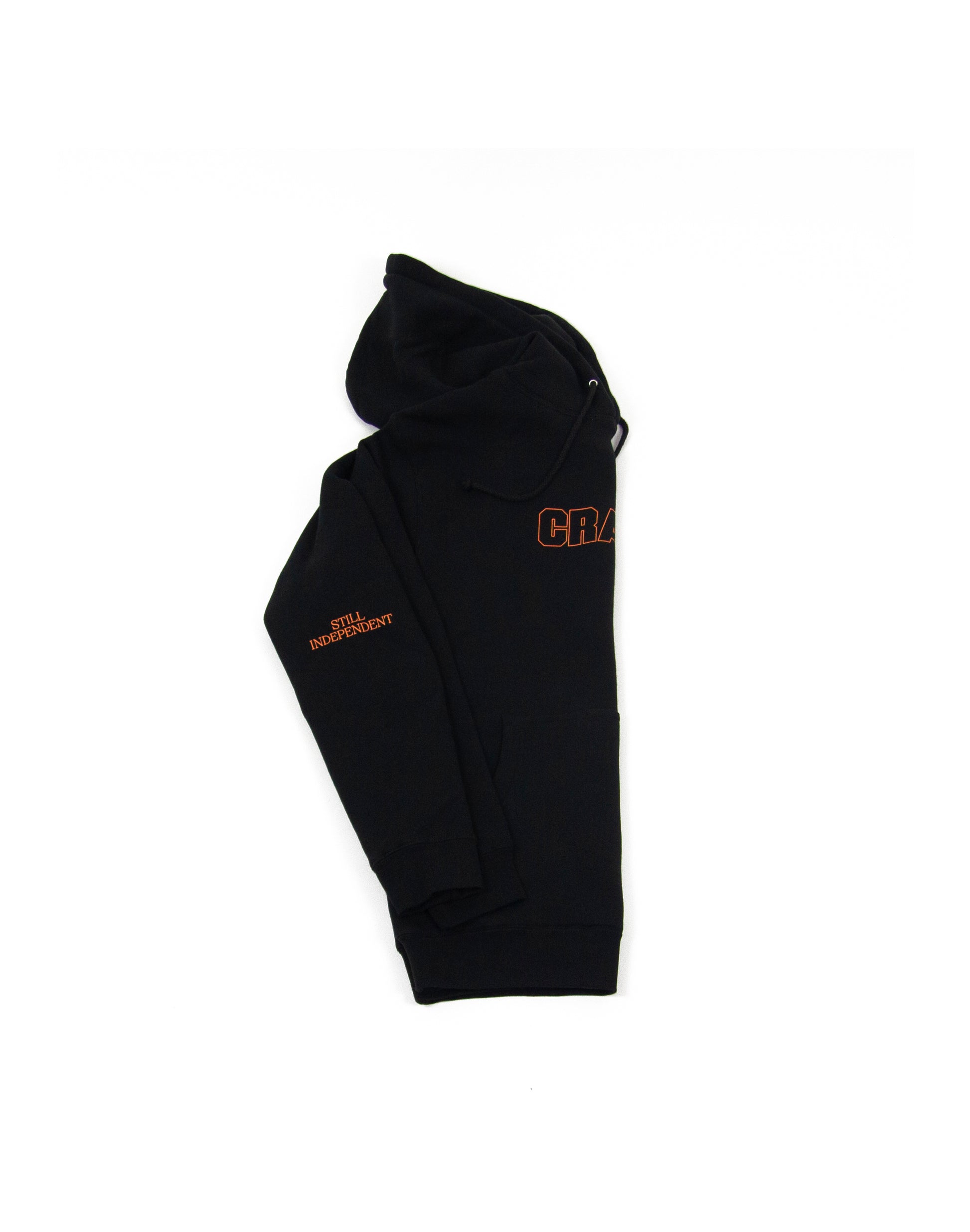 Black hoodie with bright orange print. Features the Crack logo on the front and 'Still Independent' on the sleeves.