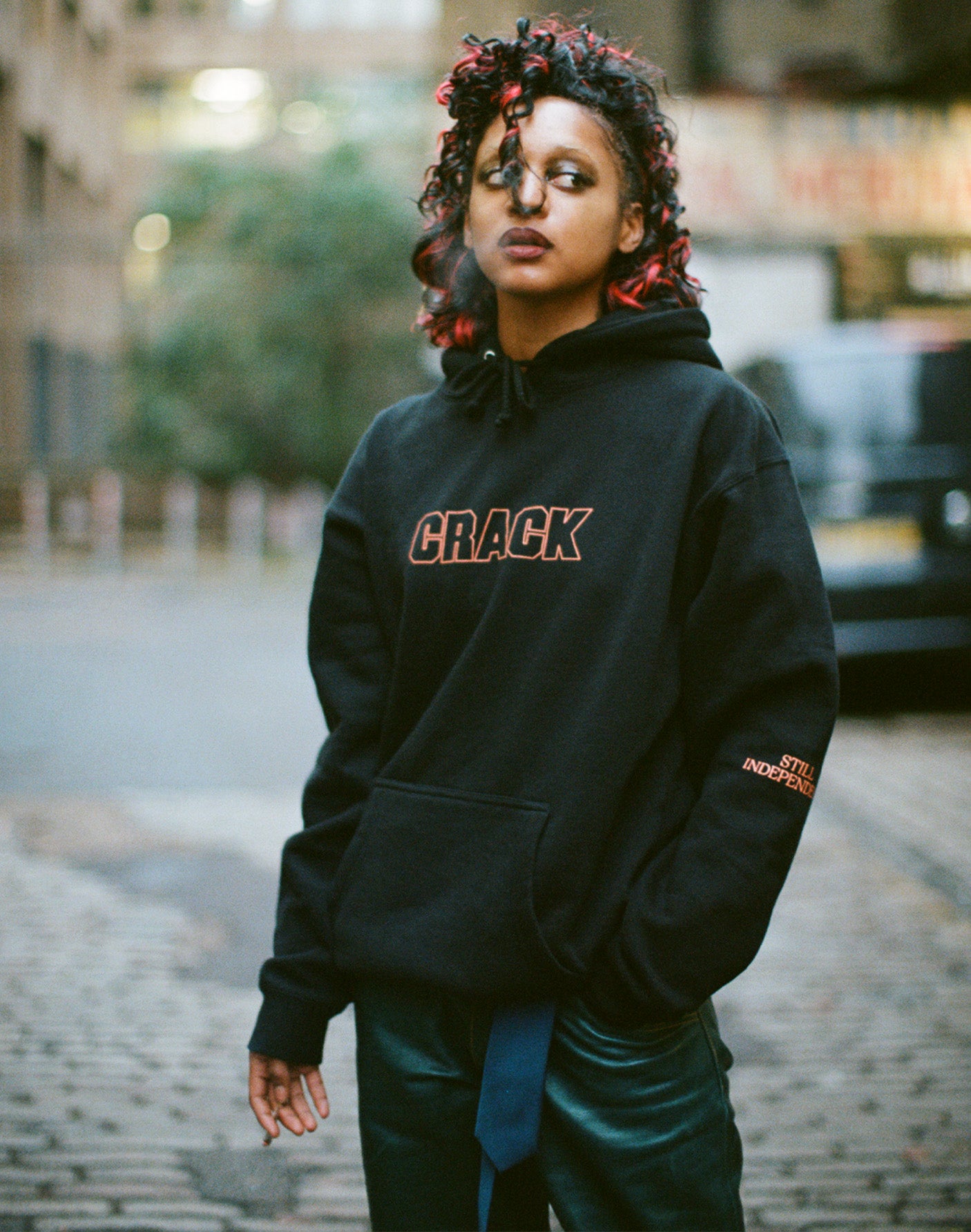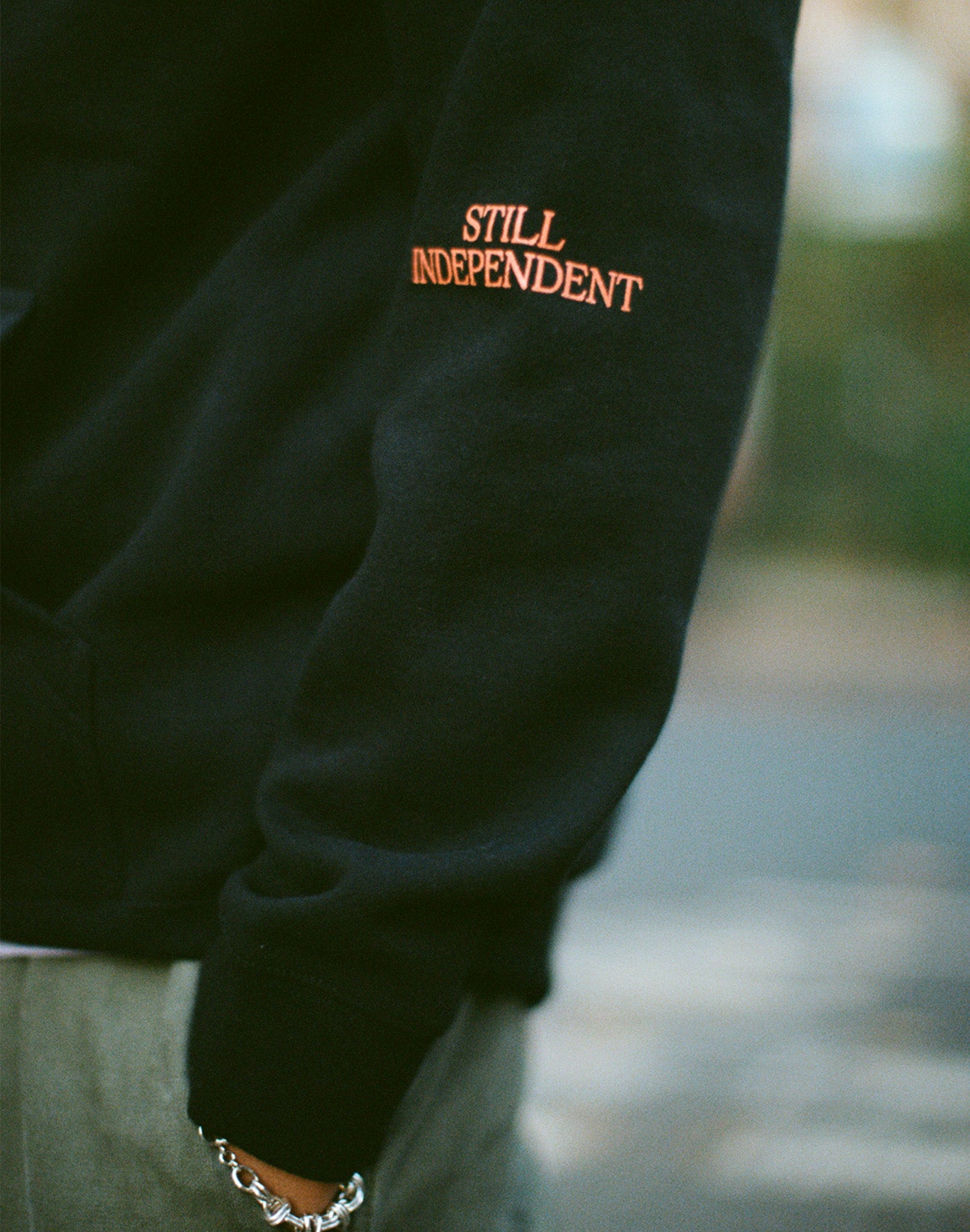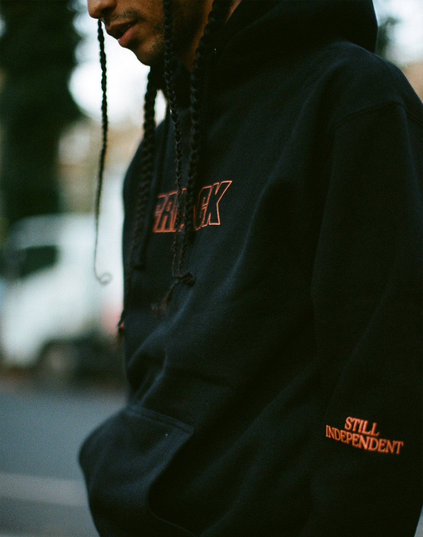 Black hoodie with bright orange print. Features the Crack logo on the front and 'Still Independent' on the sleeves.