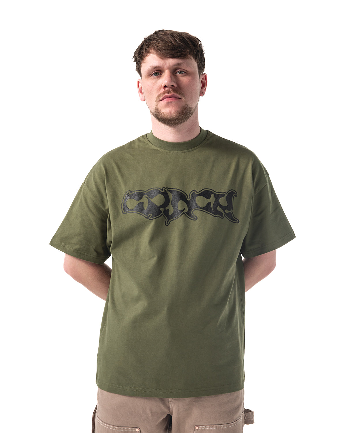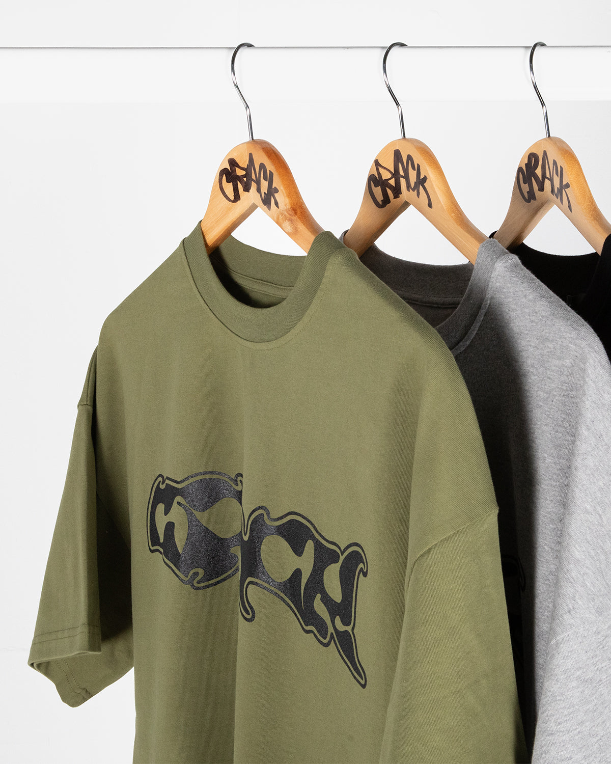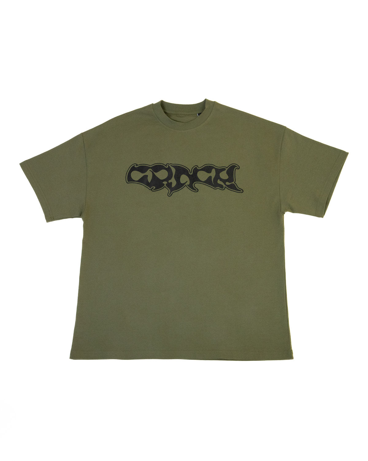 Khaki tee with screen printed black graphic 'CRACK' logo. Heavyweight and oversized fit.