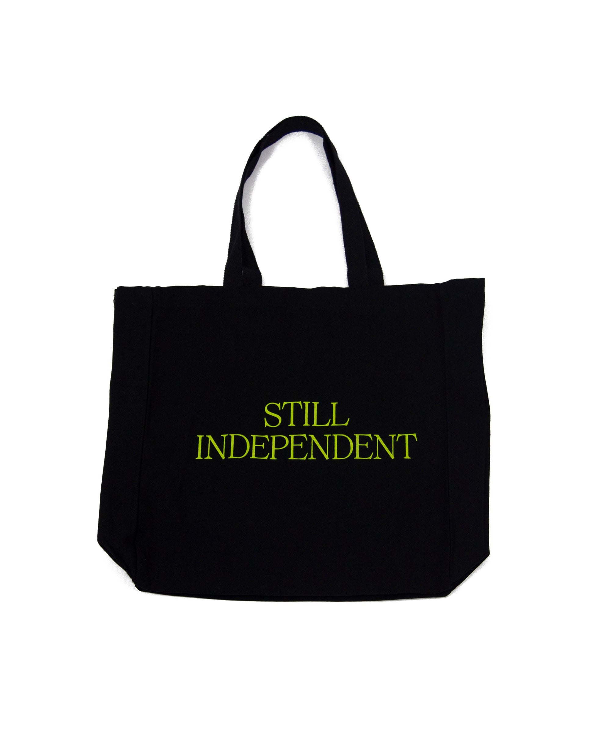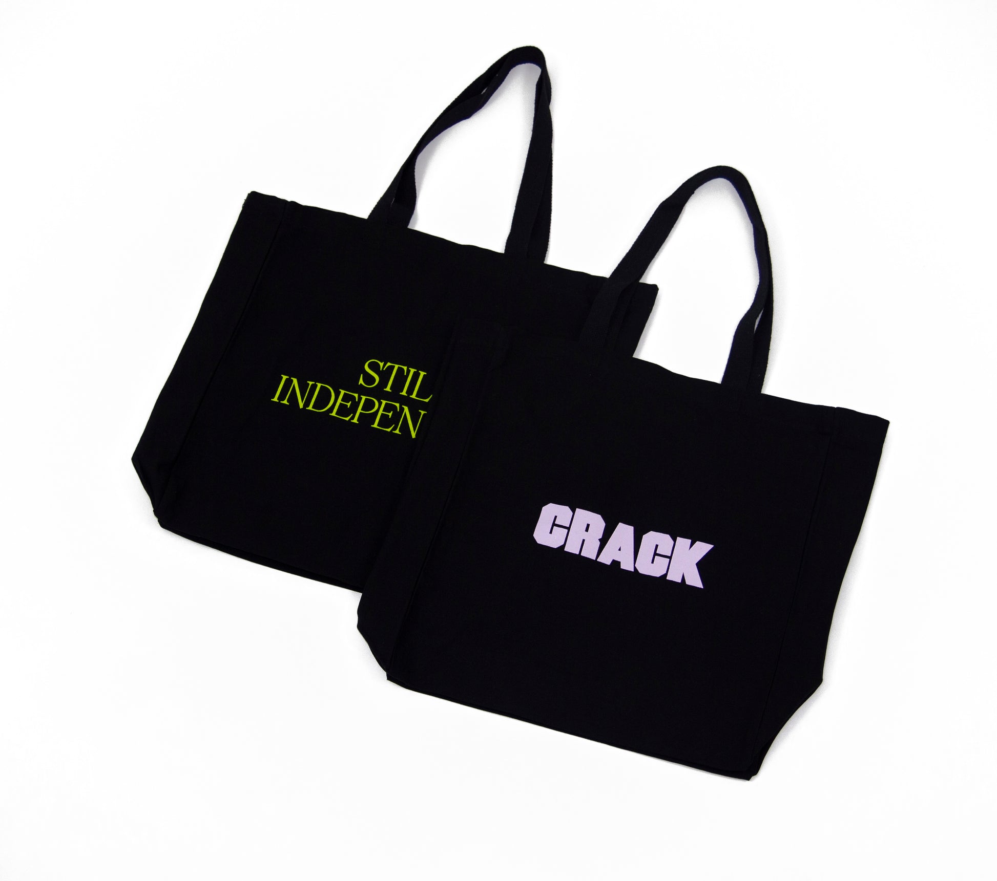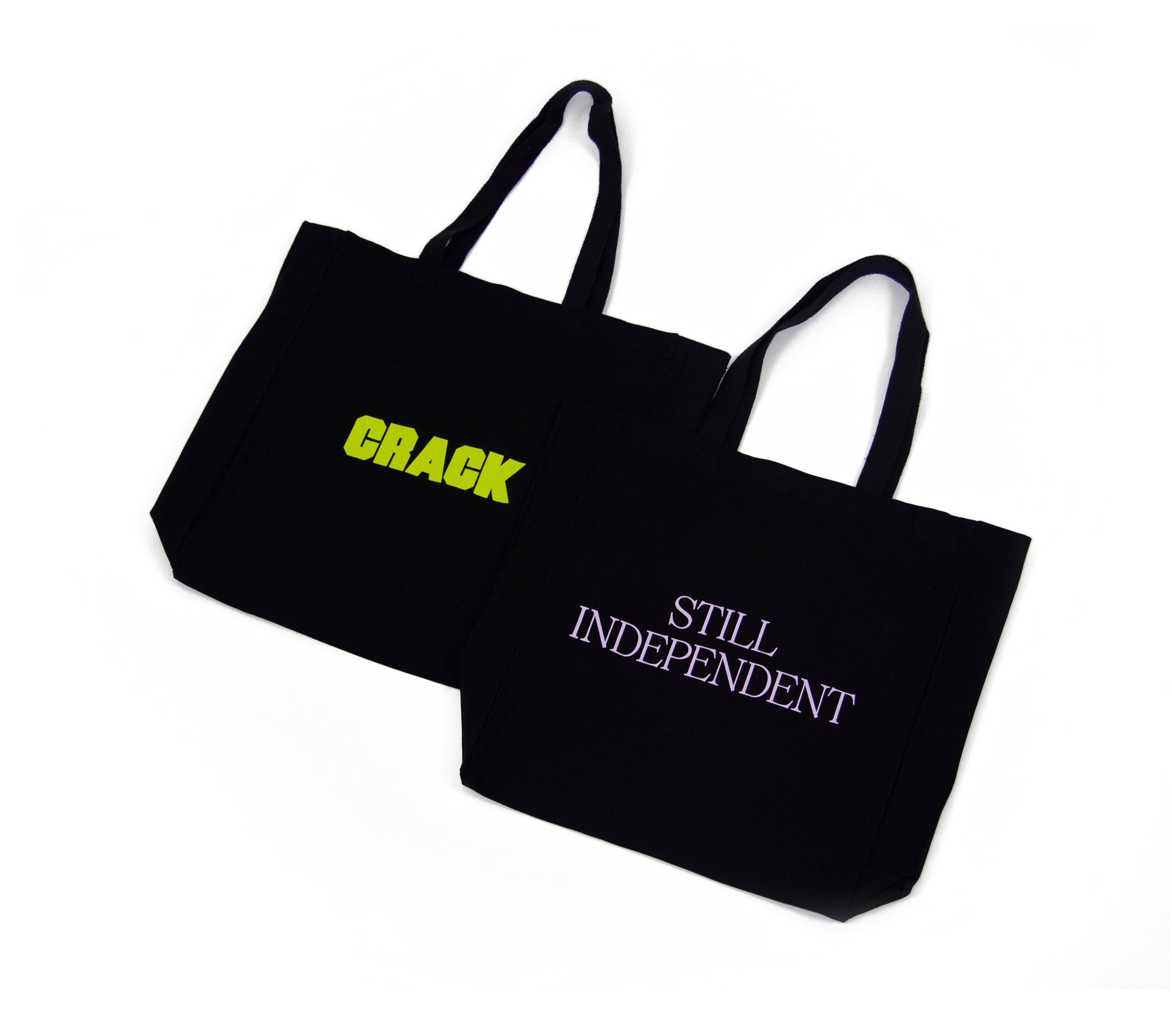 High quality black tote bag with thick straps. Printed on both sides with the Crack logo and the 'Still Independent' slogan.