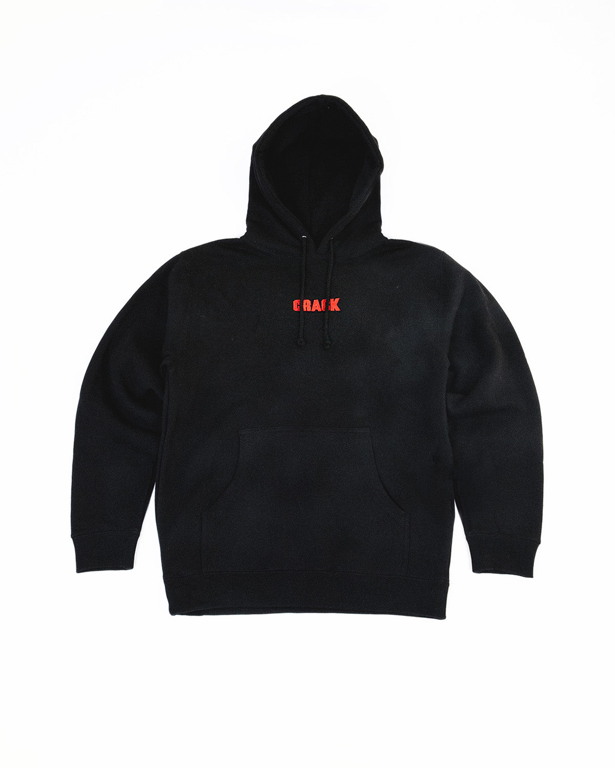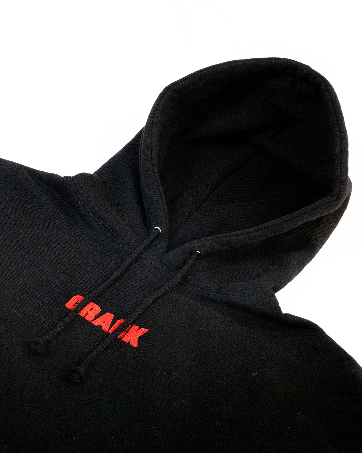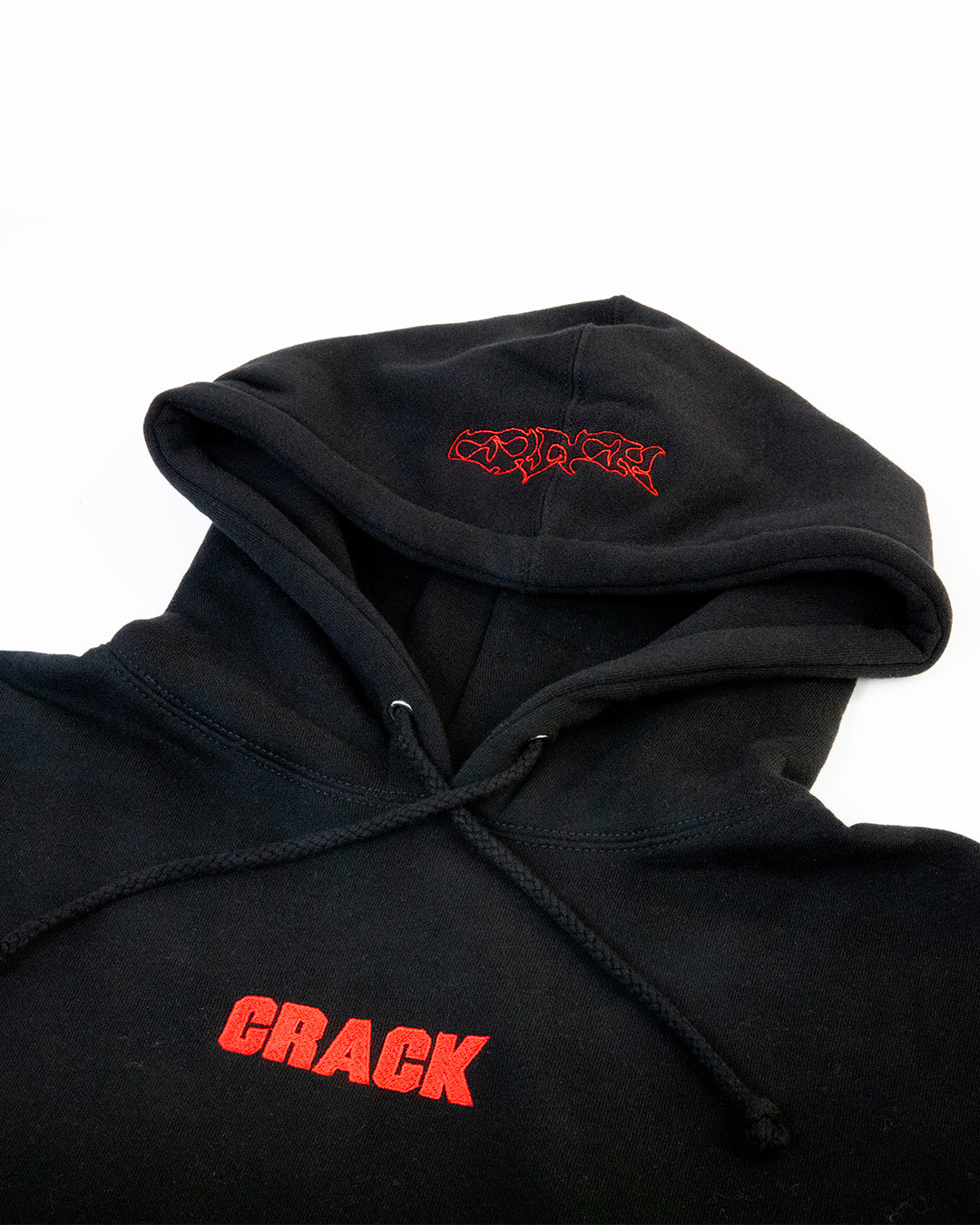 Black heavyweight hoodie with red embroidery detail. Features the classic 'CRACK' logo on the chest and a graphic logo on the hood. Oversized fit.