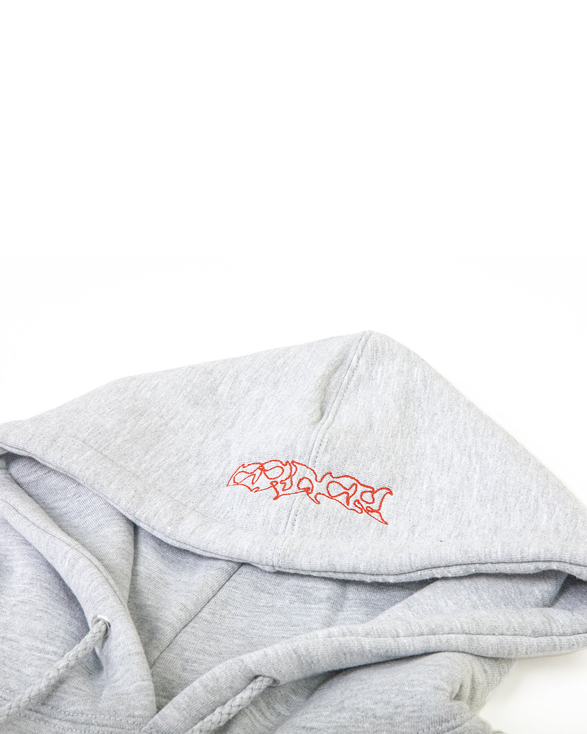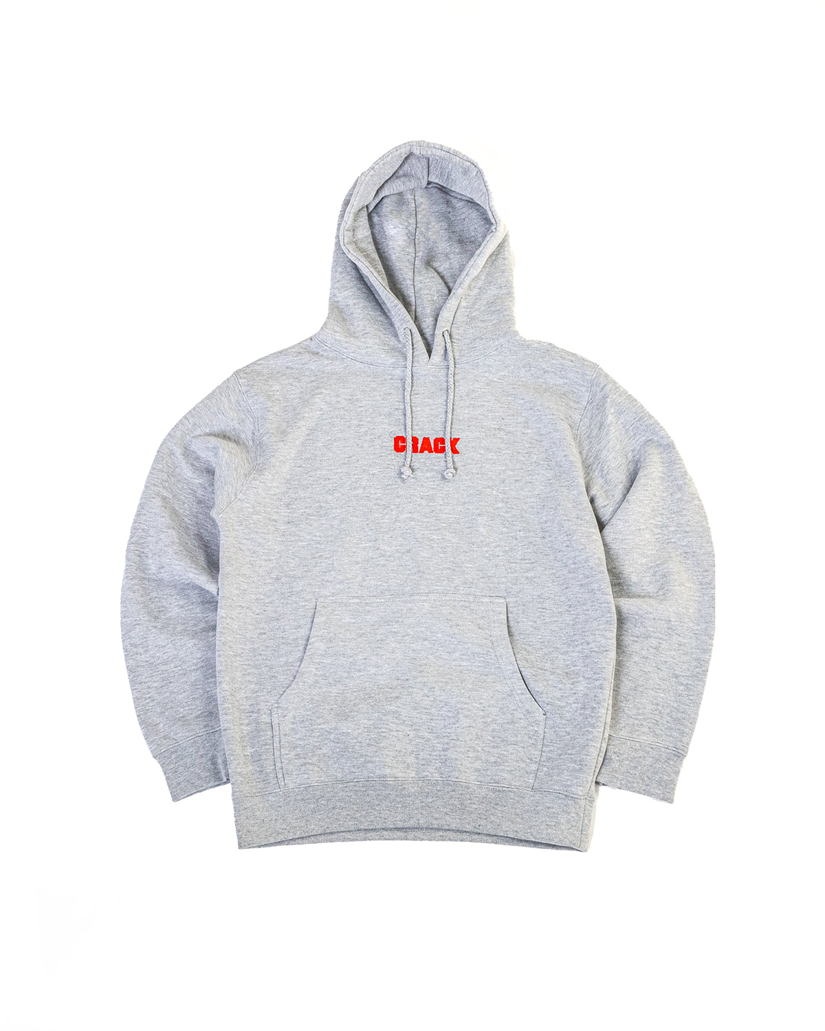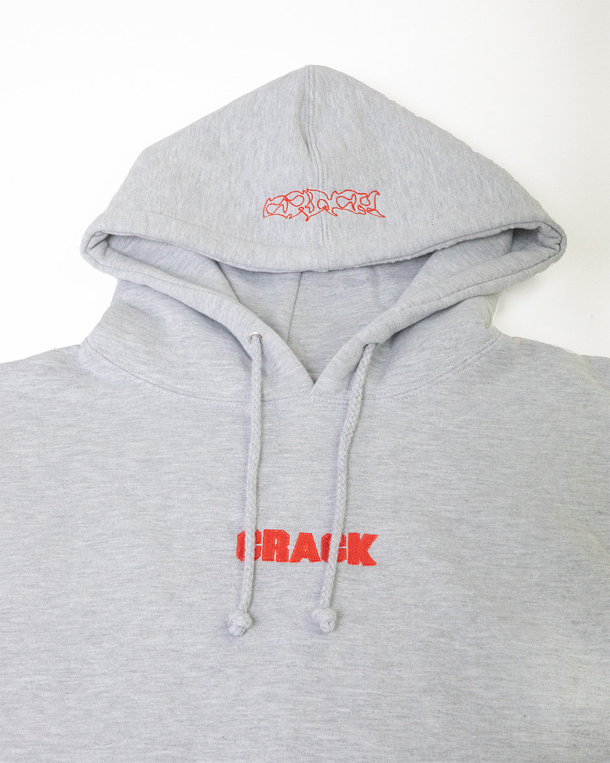 Grey heavyweight hoodie with red embroidery detail. Features the classic 'CRACK' logo on the chest and a graphic logo on the hood. Oversized fit.