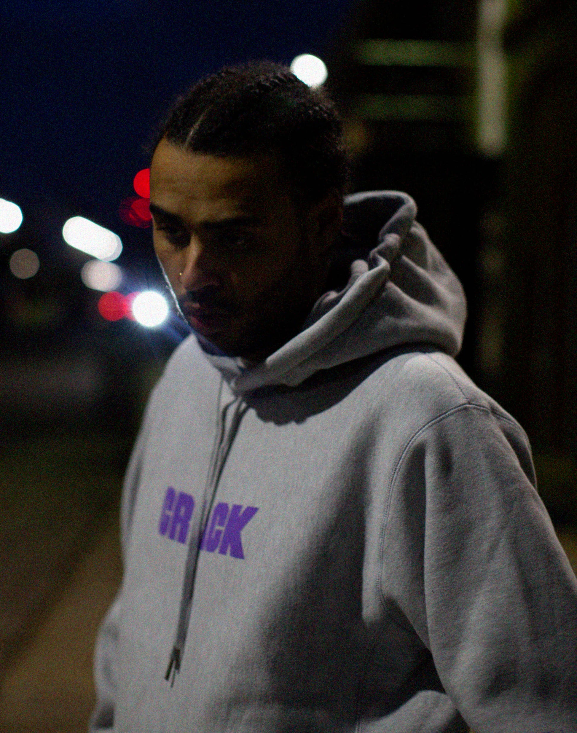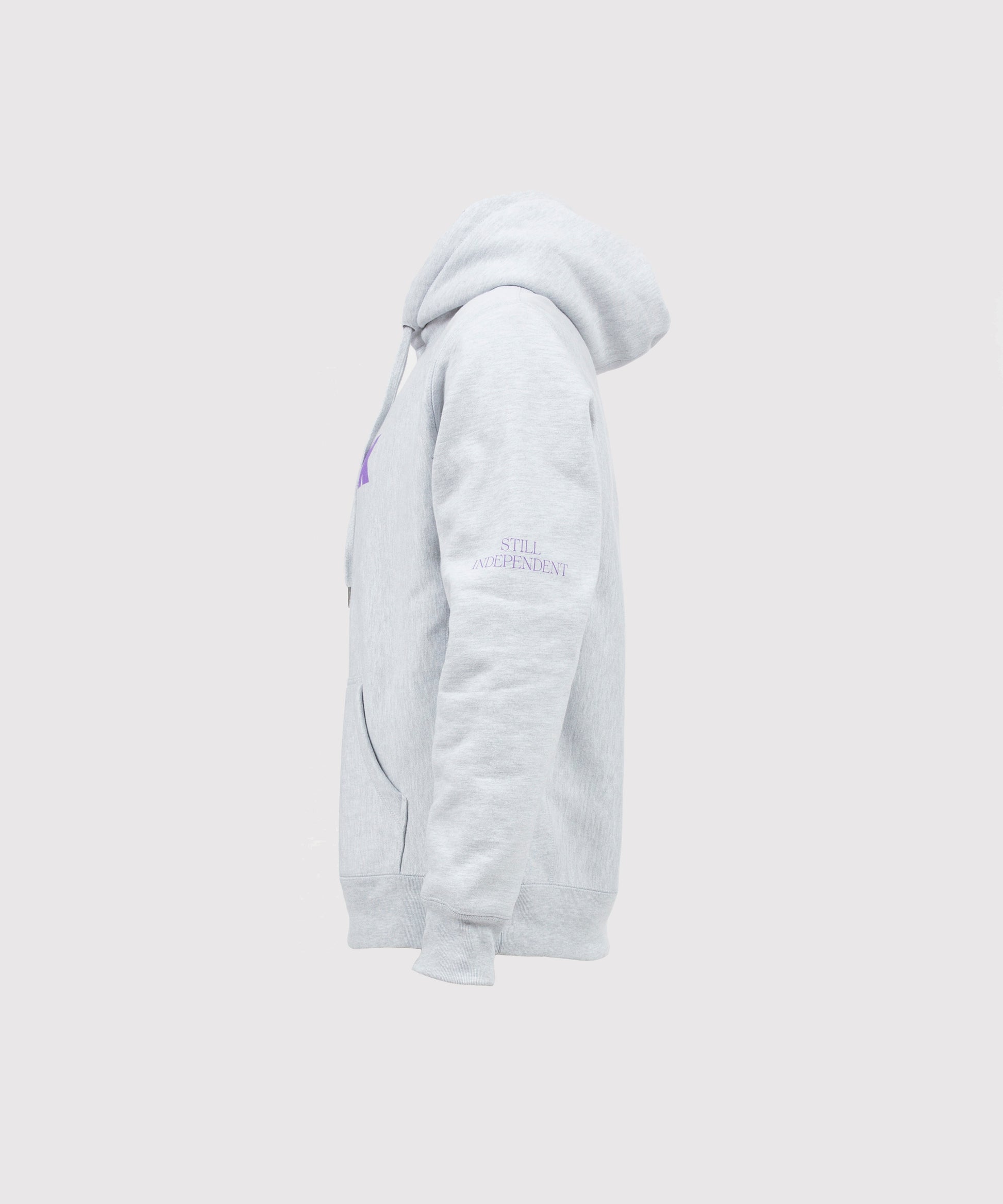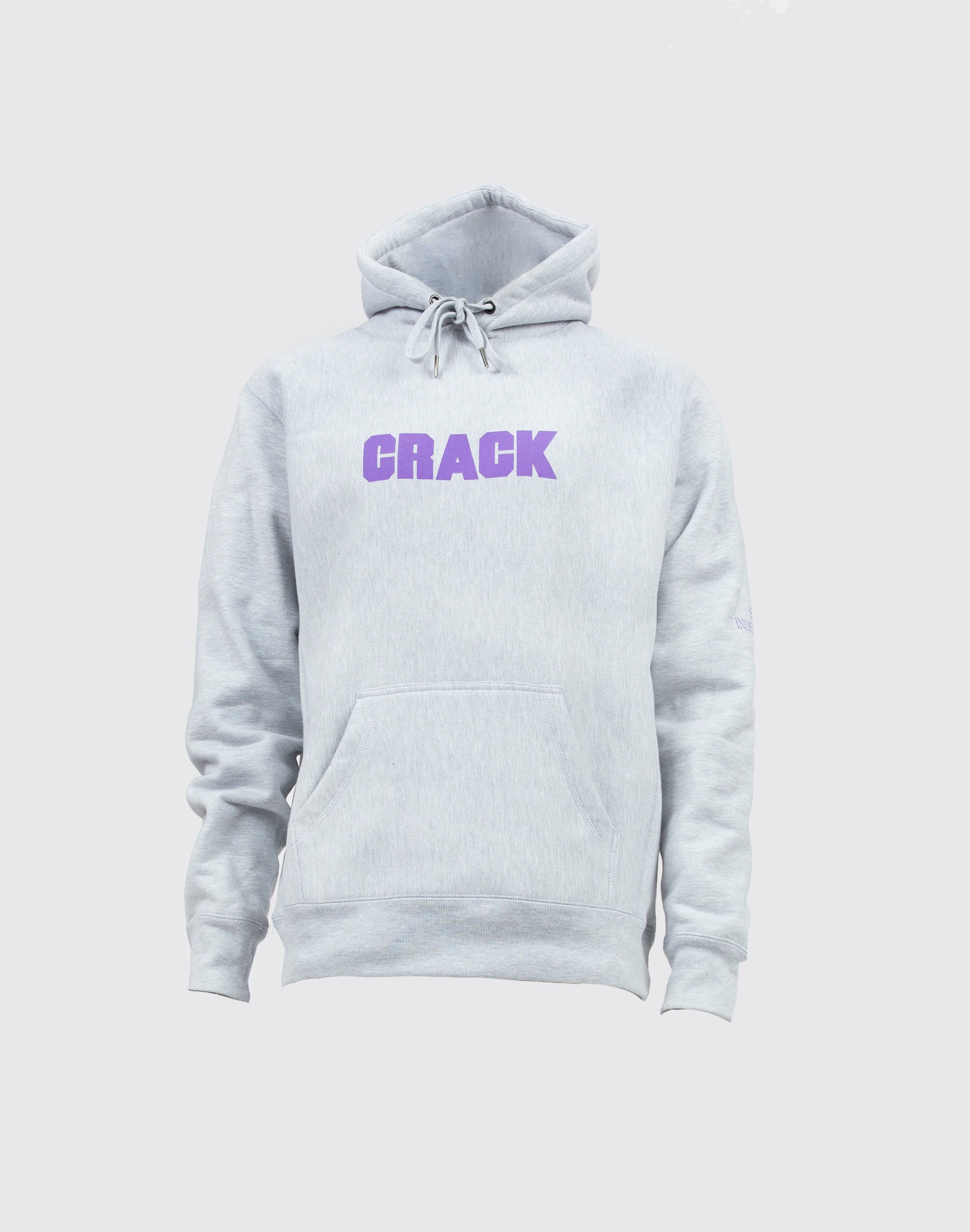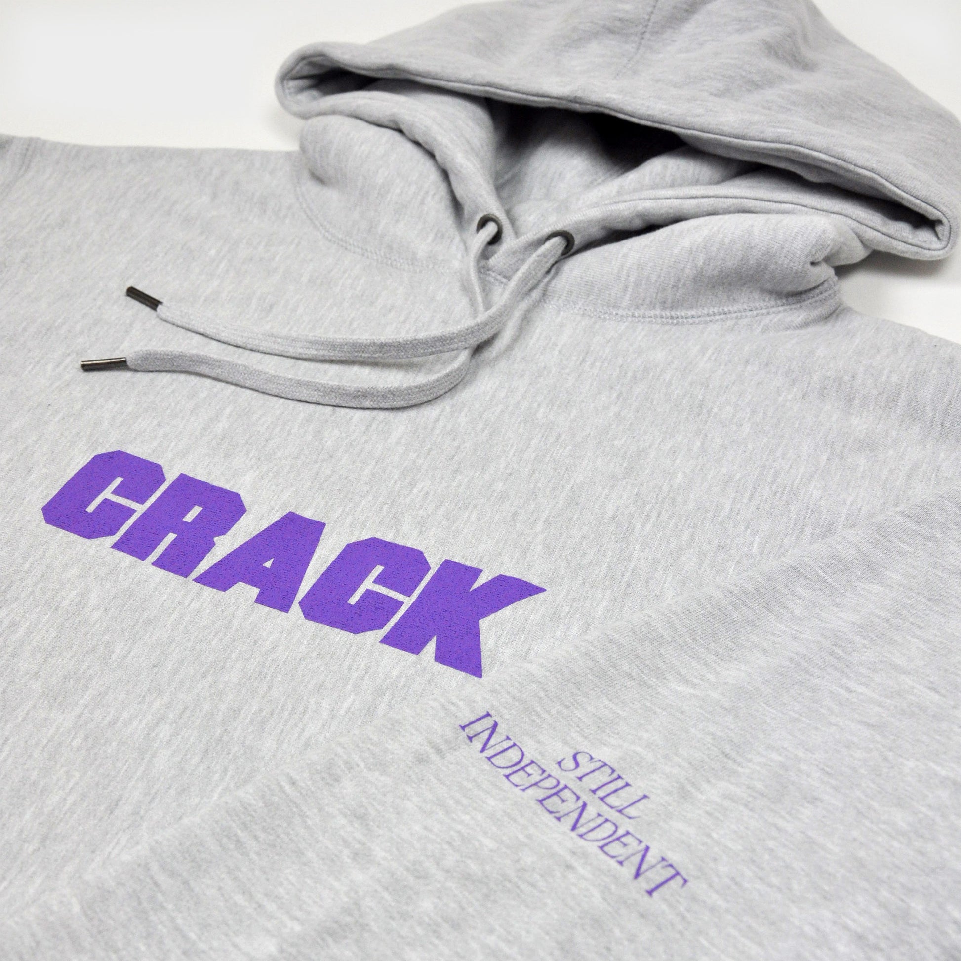 Grey hoodie with purple print. Features the Crack logo on the front and 'Still Independent' on the sleeves. Oversized fit.